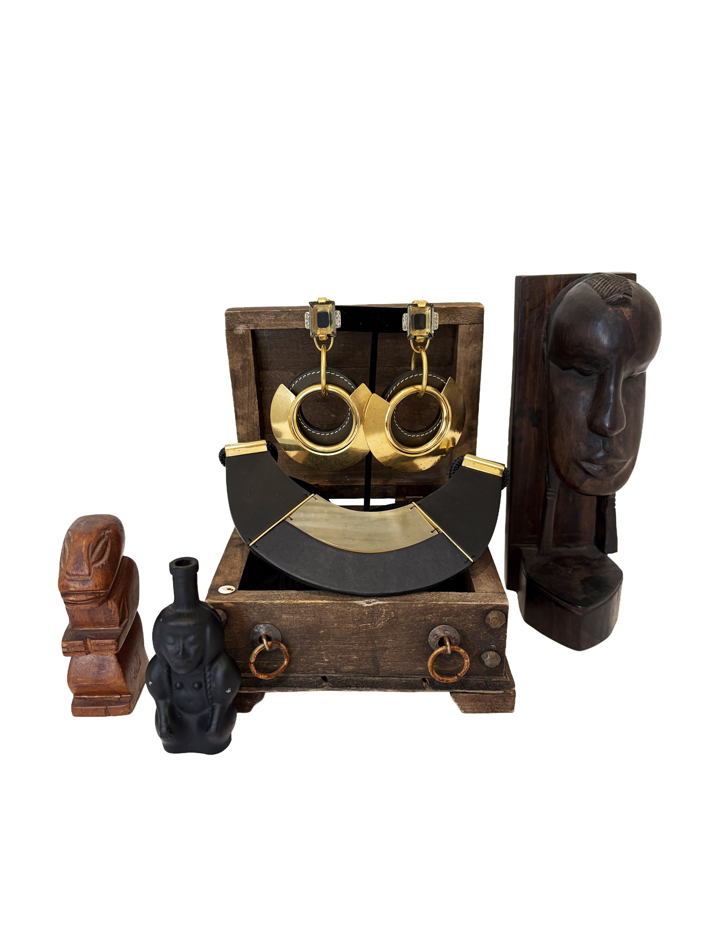 Vintage Marni Earrings with a large, architectural gold-tone & brown leather hoop design resembling a door knocker, paired with a geometric top piece.